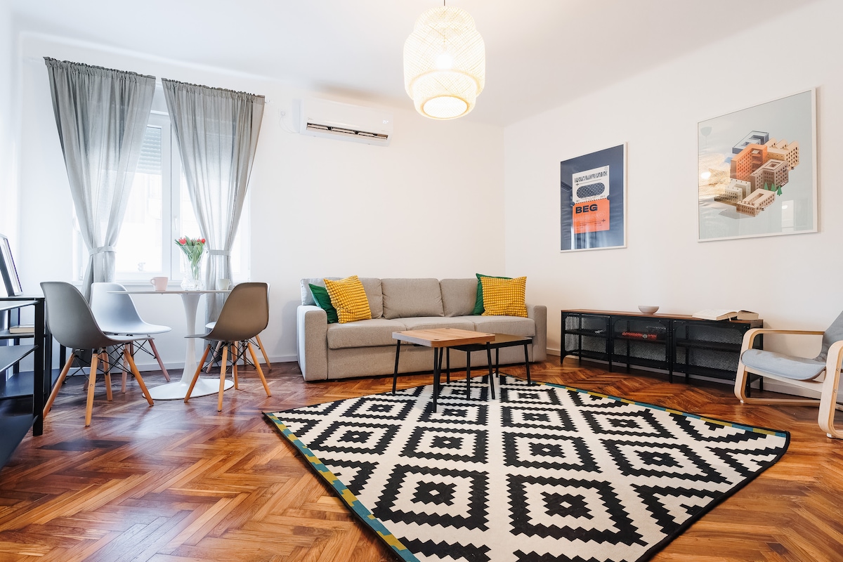 Cet appartement de 80 mètres carrés dispose de deux chambres divisées par une grande cuisine/salle à manger/salon. L'appartement est situé à distance de marche des principaux sites touristiques de Belgrade – Assemblée nationale, Musée et Théâtre, rue Knez Mihajlova, forteresse Kalemegdan, Skadarlija (le quartier bohème). Les clients peuvent trouver diverses options de nourriture et de boissons dans les restaurants, cafés et pubs à proximité. Certains des restaurants les mieux notés se trouvent dans cette zone. Il y a une épicerie 24h/24 et 7j/7 au coin de la rue.