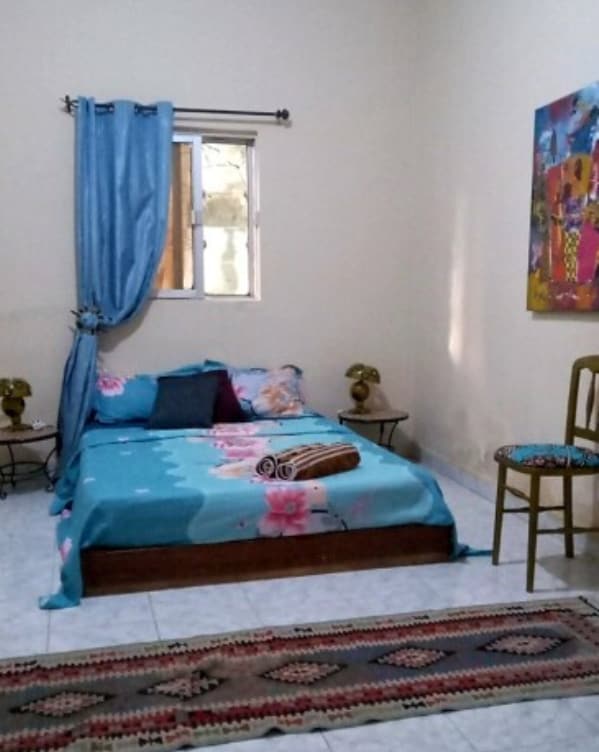 À distance de marche de la plage,des supermarchés,des bars, des restos à Senegambia strip Kololi 4 chambres avec lit double,salle de bain avec WC, douche,coffre-fort,ventilateur,climatisation. Salon avec télévision,ventilateur et canapé. salle à manger avec chaises,table,ventilateur. La cuisine dispose d'un réfrigérateur, d'unecuisinière à eau, d'un gazrange, d'un ventilateur. Jardin fleuri vert,piscine, barbecue, douche extérieure,chaises longues,parasol,abri, table, chaises longues. Wifi, entretien du jardin/de la piscine,eau incluse Prix en fonction de l'occupation ! Solaire ET SECOURS du générateur ! L'électricité doit être payée par les voyageurs.