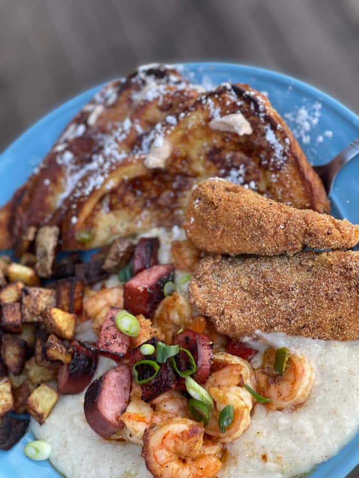 Les voyageurs peuvent choisir une entrée principale pour le groupe : poulet et gaufres, pain perdu ou crevettes et bouillie de maïs. Tous les repas comprennent du bacon, des œufs et des pommes de terre pour le petit déjeuner, préparés frais sur place.