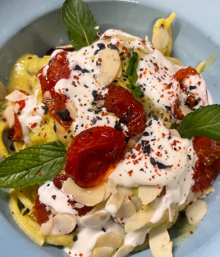 - pesto de pistache, tomates cerises confites et fromage burrata