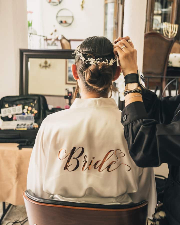 Si vous avez déjà quelqu'un pour vous maquiller et que vous recherchez seulement une coiffure de mariée longue durée, élégante et qui dure toute la fête, ce service est pour vous. Comprend le séchage, la préparation des cheveux, la fixation longue durée et la pose d'accessoires ou d'un voile. (Ne comprend pas l'essai de coiffure)