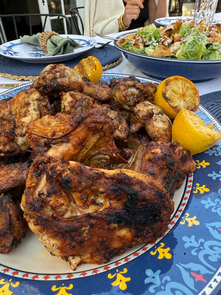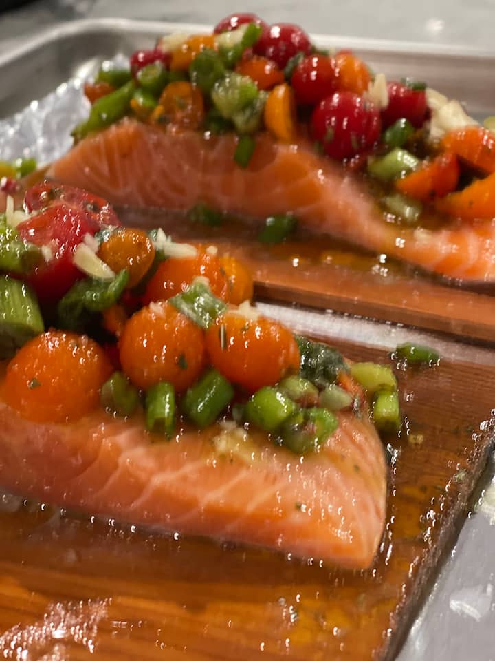 Cette offre d'inspiration côtière comprend un saumon fumé sur planche de cèdre, des légumes verts grillés, du poulet chimichurri piquant, une salade César classique et une tarte crémeuse aux baies.