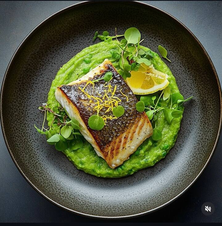• Bar chilien poêlé avec risotto à la truffe noire, légumes et bouillon crémeux au fenouil.