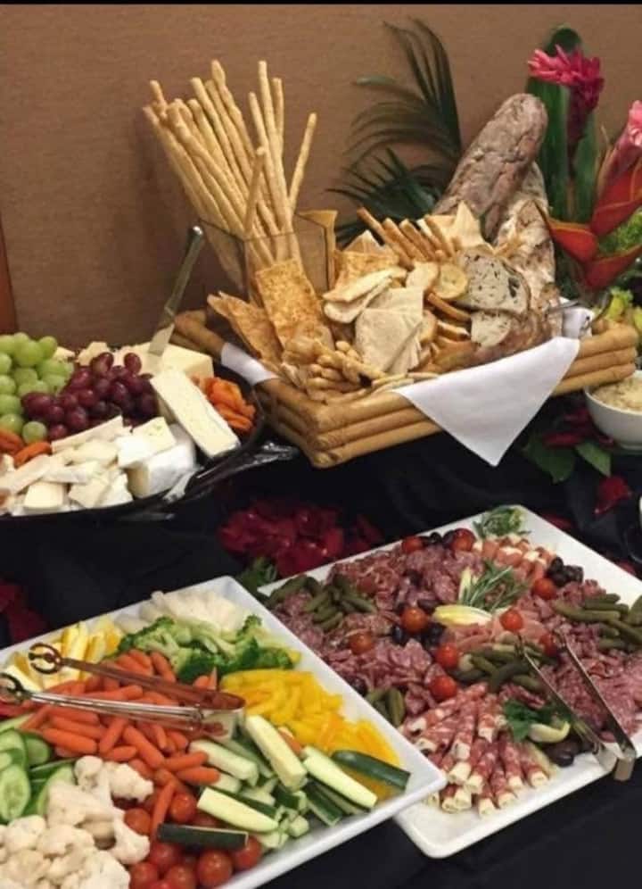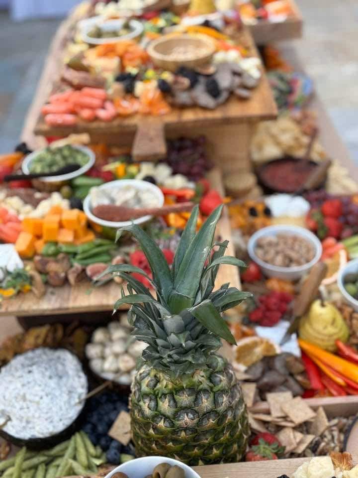 Un menu de brunch soigné et personnalisable, avec fritatta, charcuterie, fromage, plateau de fruits, bar à yaourts et assortiment de pains