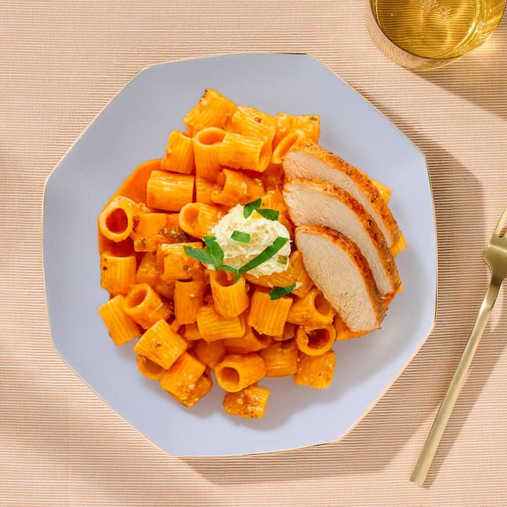 Rigatoni à la sauce rose | Rigatoni dans une sauce crémeuse à la tomate et aux échalotes douces, garnis de poulet poêlé, de ricotta parfumée au citron, de parmesan et de basilic frais.