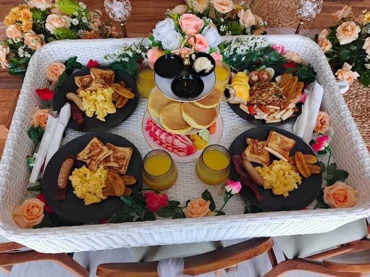 Nous vous accueillons le matin avec des plats de petit déjeuner classiques, les menus que nous proposons sont le petit déjeuner indonésien, le petit déjeuner américain, le petit déjeuner continental et le petit déjeuner végétarien. Bien sûr, les ingrédients et le service sont inclus dans le prix