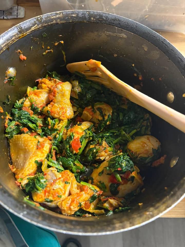 Découvrez les saveurs vibrantes du Nigeria avec l'Efo Riro, un ragoût d'épinards copieux et cuit lentement, composé de légumes frais, de poivrons, de tomates et d'un mélange d'épices aromatiques. De tendres morceaux de bœuf, de poulet ou de poisson mijotés dans une sauce riche et savoureuse, pour un repas à la fois réconfortant et savoureux.