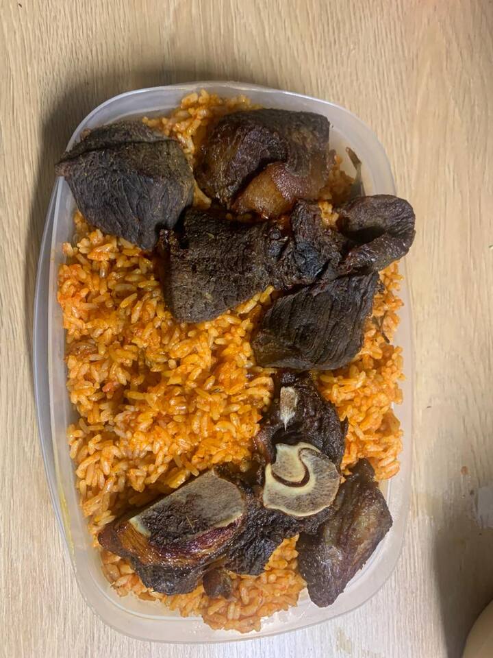 Ce plat est composé de riz Jollof savoureux, cuit lentement, infusé de tomates riches, de poivrons et d'épices aromatiques, servi avec du bœuf frit tendre et parfaitement assaisonné. Chaque repas est fraîchement préparé avec des ingrédients de qualité, un assaisonnement équilibré et une attention particulière au goût et à la présentation.