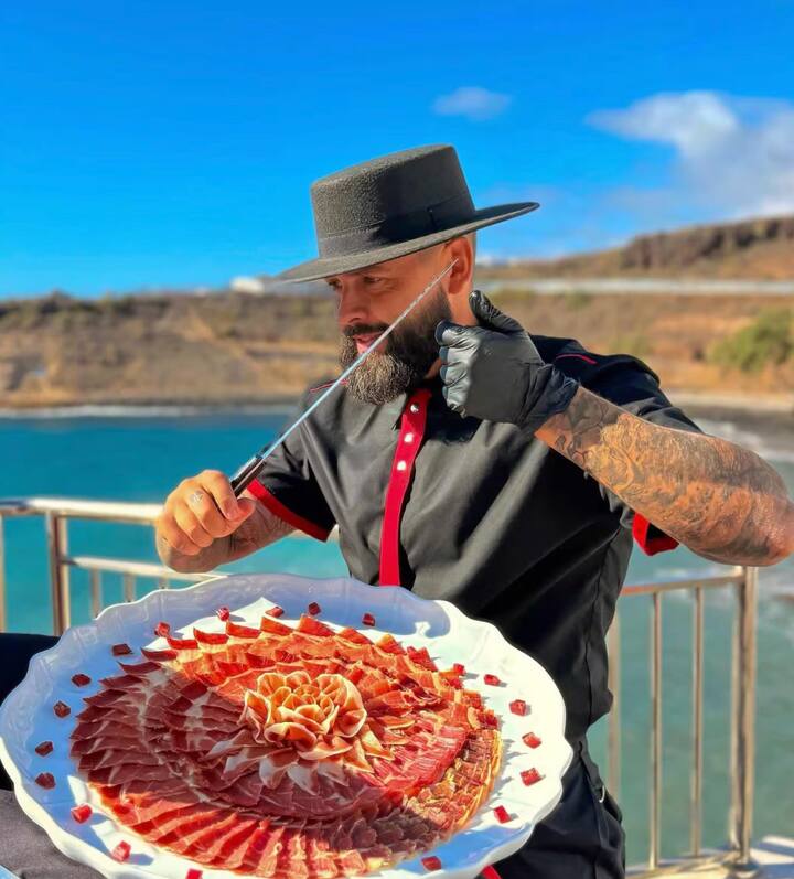 Découpe de jambon ibérique en direct, en privé, chez vous ou dans votre villa, par Julio García, professionnel de la découpe de jambon. Une expérience artistique exclusive pour les couples, les groupes ou les événements privés.