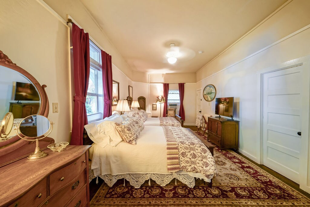 Détendez-vous à Golden Jubilee, une suite luxueuse dans le centre-ville de Weaverville qui constitue le point de départ idéal pour toutes vos aventures dans le comté de Trinity, que vous rendiez visite à vos amis/votre famille, que vous pêchiez ou que vous exploriez les Alpes de la Trinité. Cette suite ensoleillée dispose d'un lit à baldaquin queen size, d'un coin salon confortable à côté de la cheminée, d'un bureau et d'une baignoire à champagne dans la chambre. Le Golden Jubilee s'inspire des superbes textures riches et veloutées de l'époque et est décoré de verts apaisants. Tous les prix comprennent les frais de ménage.