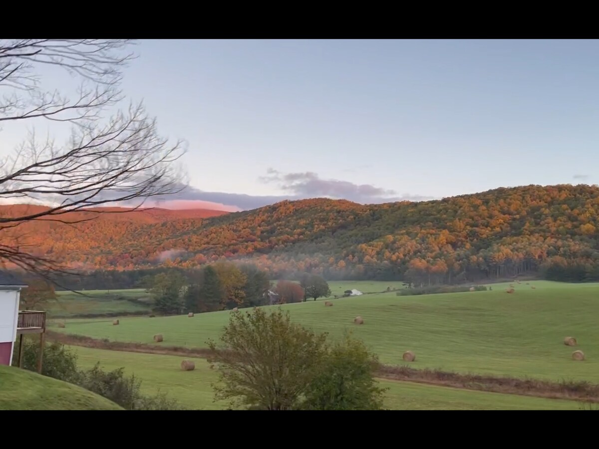 Réductions pour les séjours de 5 nuits ou plus. Situé au sommet d'une colline sur 23 acres à la ferme biologique historique Fairview, Circa 1737, le chalet récent est entouré de pâturages, de jardins biologiques, d'histoire et surplombe Harpers Ferry Gap. Nous sommes à quelques kilomètres de Charles Town, Harpers Ferry, Shepherdstown, du Hollywood Casino, du sentier des Appalaches, des rivières Shenandoah et Potomac et de nombreux sites historiques. Profitez du lever du soleil depuis la terrasse et des couchers de soleil depuis le porche.
