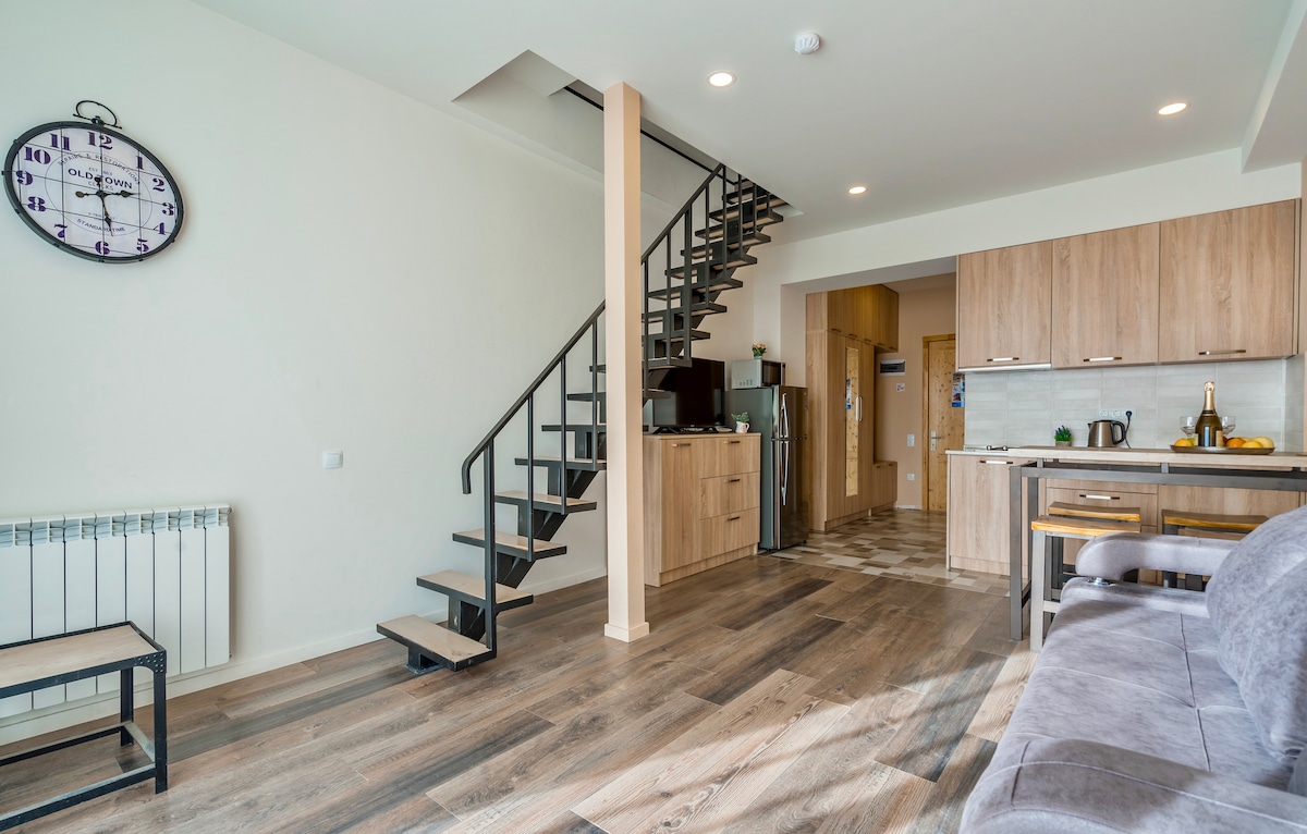 Un appartement à louer à Gudauri, situé dans l'hôtel 5 étoiles « Gudauri Loft ». L'hôtel est idéalement situé à côté de la première piste de ski. La chambre dispose d'une cuisine d'angle, d'une salle de bains, d'un réfrigérateur, d'un grille-pain, d'une cuisinière électrique, d'une bouilloire électrique et de divers autres appareils de cuisine pour votre commodité. De plus, la chambre comprend une télévision à plasma, une connexion Internet haut débit, une connexion Wi-Fi gratuite, un mobilier élégant, du linge de lit frais et des serviettes. Nous vous souhaitons un séjour agréable et mémorable !