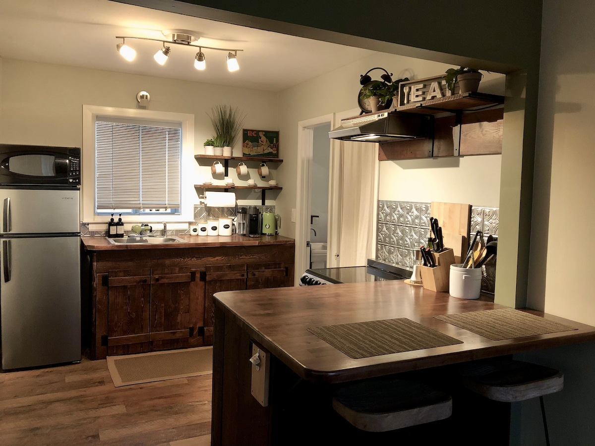 Blottissez-vous près d'un feu rugissant. Mangez dans un coin ou à un comptoir en bois rustique près d'une fenêtre. Cette maison pittoresque et fantaisiste dispose d'une terrasse privée avec barbecue, d'un jardin avec hamac et d'un foyer. Un lit Murphy de grande taille avec une cuisine complète (sauf pour un four). Vous aurez accès à l'ensemble de la maison d'hôtes. À quelques minutes en voiture de la belle, éclectique et funky ville de Woodstock. Art et culture, restaurants, randonnée et vélo à proximité. Chauffage électrique, ventilateur au plafond, unité de climatisation sur pied et douche pour une personne.