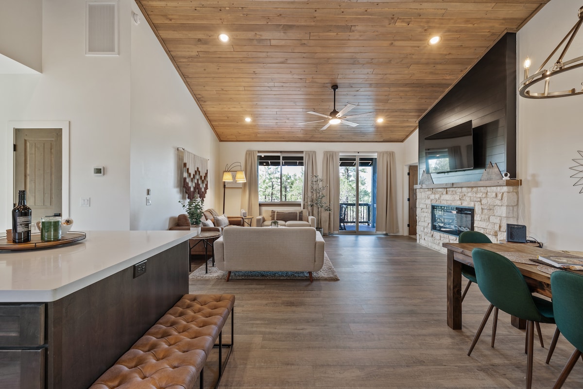 BIENVENUE dans votre retraite confortable. C'est l'escapade PARFAITE ! Un élégant 2 chambres/2 salles de bain qui dispose également d'un foyer intérieur, d'un garage pour 2 voitures et d'un patio avant et arrière ! Toute nouvelle construction, construite en 2022 ! Également inclus : * Garage pour 2 voitures * Le plan d'étage divisé permet l'intimité ; * Des sièges confortables pour vous réunir pour parler, regarder la télévision et jouer ; * Profitez du patio couvert avec vue sur la forêt nationale C'est l'escapade idéale pour tout le monde ou pour toute la famille.