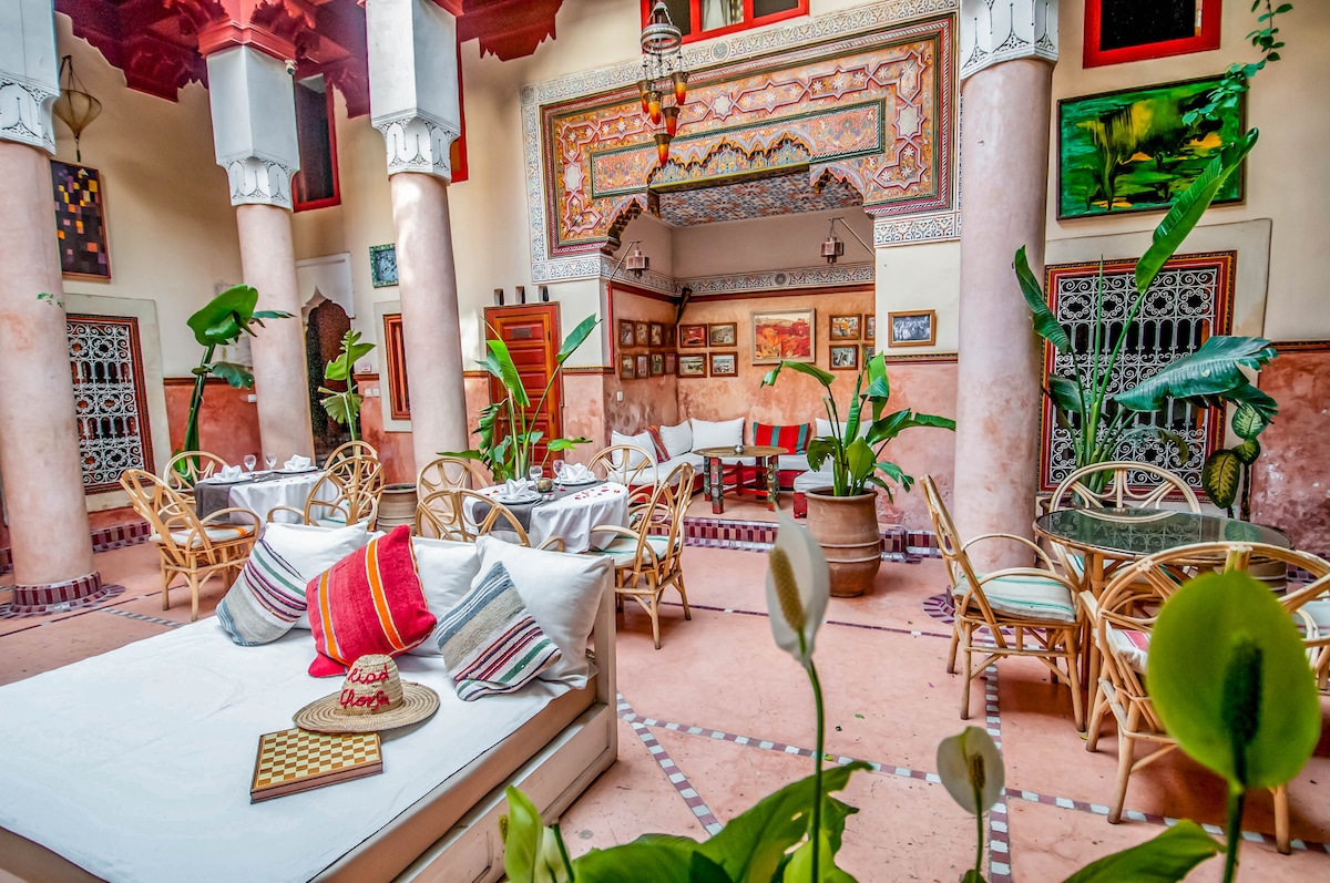 Authentique Riad rénové, très facile d’accès , grand patio avec Bhou et bassin . Situé dans un quartier typique, sécurisé et hyper commerçant à 3 mn à pied de l’entrée des souks côté Jardin Secret, musée de la femme … et à moins de 20 mn à pied des jardins de Majorelle et 30 mn du quartier du Gueliz. Incontournable marché de Bab Doukala au bout de la rue . Malika et Samad seront si vous le souhaitez à votre disposition pour vos transferts , excursions, petits déjeuners, dîners ou autres.