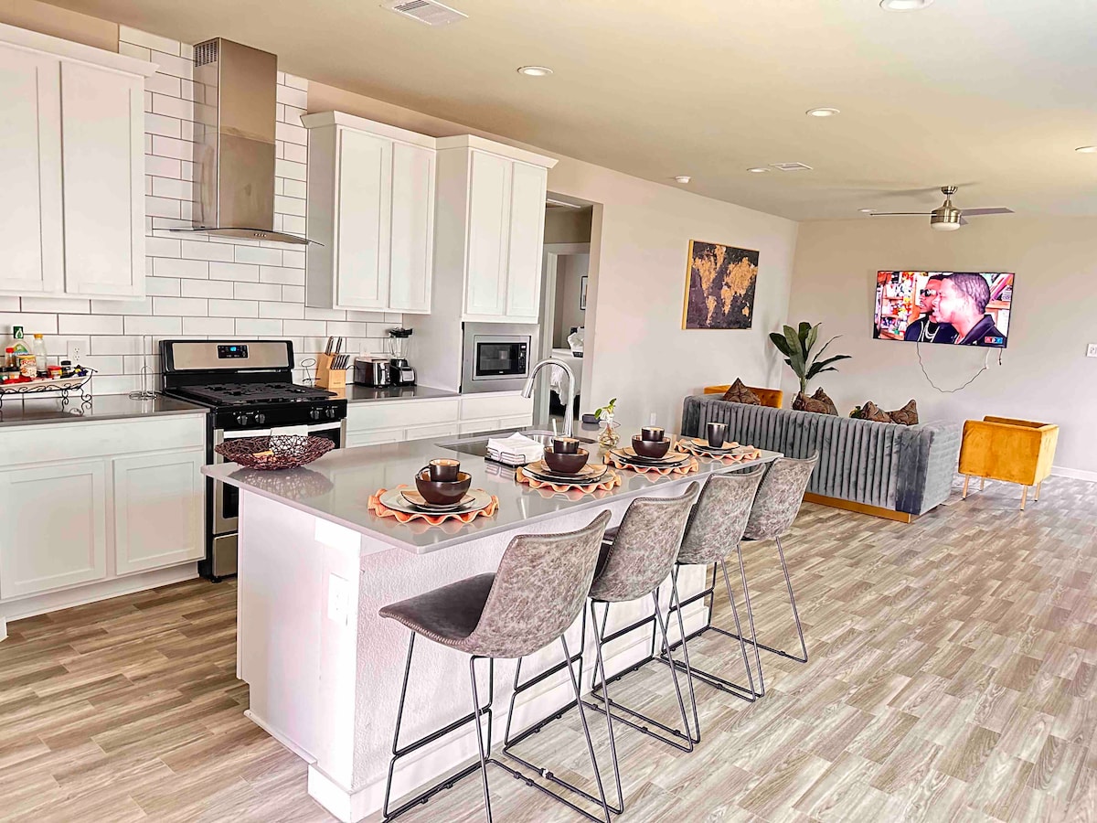 Découvrez le luxe dans cette maison de ville de Houston avec 3 chambres, chacune avec une salle de bain privée/TV. La maison intelligente dispose de serrures, de lumières, d'aspirateurs et de thermostats automatisés. Le 2e étage est un espace ouvert avec une cuisine, une salle à manger et un coin salon avec une télévision Samsung de 85 pouces, une table de billard, des jeux de société et un minibar. Il y a un petit poste de travail dans la chambre du bas et un espace bureau avec un poste de travail complet. Profitez du coin salon dans l'arrière-cour. Situé à moins de 5 miles du NRG Stadium et du Minute Maid Park.