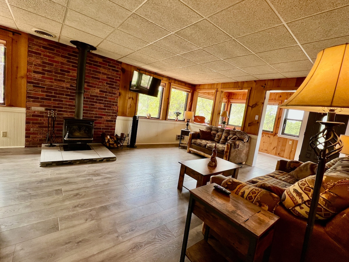 Our stone home on 5 acres (1st acre surrounding the house is fenced) is a quiet gated retreat at the very end of a gravel road. The living space is cozy and comfortable w wood burning stove. Wifi. Ethernet available. Large kitchen w/ dining area w seating for 6. Roku TV in each BR. Two BR. Queen & queen + single.Full laundry. Covered pergola off of kitchen w outdoor fire pit, swing, patio furniture, picnic table & twinkle lights for nightime ambience. Central air. Books, games, puzzles.