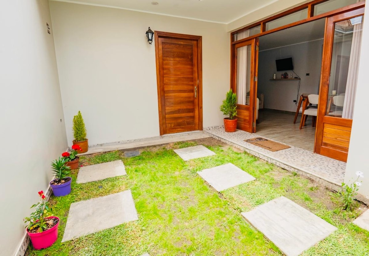 Bel appartement intérieur moderne (premier niveau avec 110 m2) entièrement équipé, idéal pour se détendre avec votre partenaire et se déconnecter du monde. À 4 min. du terminal terrestre de Huancayo, à 4 min de l'Université nationale du Centre du Pérou, à 5 min. d'EsSalud - Hôpital national Ramiro Prialé Prialé Prialé, à 15 min. du centre-ville. Situé dans un quartier calme, privé et sûr, à proximité de vastes espaces verts, de parcs, de pharmacies, de supérettes, de restaurants