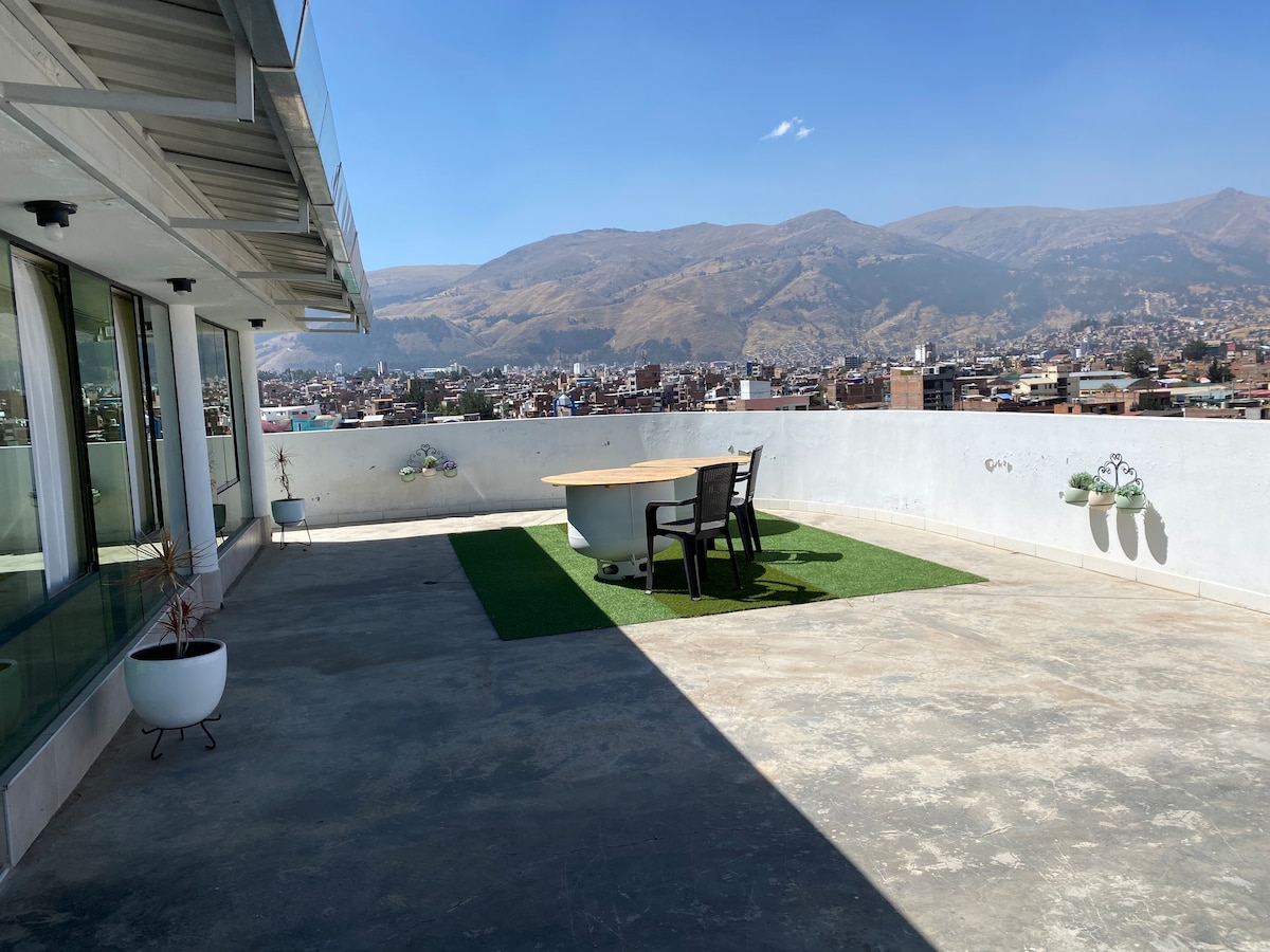 Magnifique studio avec une vue incroyable sur le paysage et la ville de Huancayo. Il reste au 6e étage. À proximité (2 pâtés de maisons ou moins) du marché de rue traditionnel, du supermarché (Plaza Vea), des banques, des centres commerciaux, de la gare routière principale (terminal Los Andes), des transports en commun pour se rendre partout ! Vous pouvez profiter de ce studio privé, partager avec un ami, avec tous les hébergements de base, eau chaude, WiFi, parking gratuit. Si vous voulez passer des vacances incroyables ou des voyages d'affaires dans la ville de Huancayo, c'est votre meilleure option.