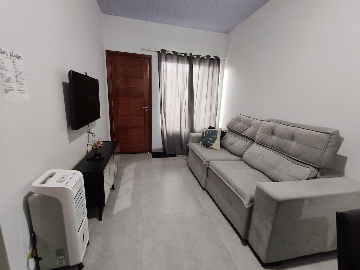 Casa localizada próximo ao centro, bairro tranquilo de fácil acesso. Oferecemos Internet, estacionamento coberto e privativo, área de churrasco com mesa de sinuca, cadeiras ao ar livre e lavabo, cozinha com itens básicos, sala aconchegante com TV smart e climatizador, banheiro social, 2 quartos com ar condicionado, sendo 1 suite com cama casal e 2 camas de solteiro, 1 quarto com cama casal e 2 colchões de solteiro extras. Lavanderia com máquina de lavar 8 kg.
