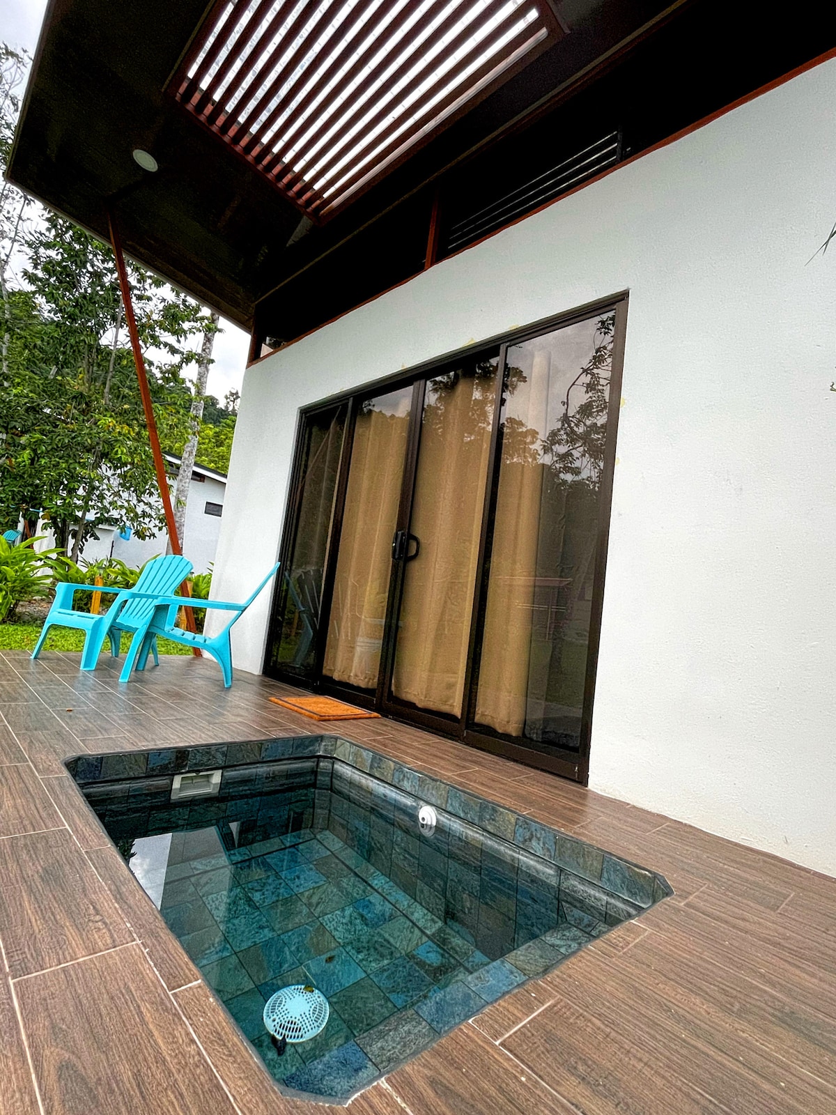 Magnifique bungalow écologique 2 personnes avec terrasse, hamac, wifi, climatiseur, eau chaude et cuisine entièrement équipée dans une petite propriété avec piscine à l'intérieur d'un jardin tropical luxuriant. *À 5 minutes à pied de la plage de Playa Chiquita et à 12 minutes en voiture du centre-ville de Puerto Viejo. * Stationnement ombragé plus deux ports de recharge pour les véhicules électriques sur la propriété (220 et 110 V) !