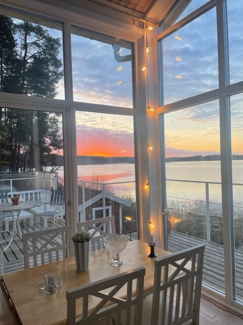 Deux charmantes maisons récemment décorées, un grand jardin privé, une jetée, un bateau, un sauna et des doubles patios avec soleil du matin au coucher du soleil. Cette maison de vacances est idéalement située avec un lac privé orienté plein sud, sans voisins et avec un soleil du soir maximum. Ici, 1 à 2 familles peuvent séjourner et profiter de la baignade, de la pêche et des activités. La maison d'hôtes dispose d'une salle de bains attenante et de 4 lits. La grande maison dispose d'une cuisine, d'une salle de bain, d'un salon, d'une véranda punch, d'une chambre avec lit double et d'une alcôve avec lit double. Hyrs ut tor-tor.