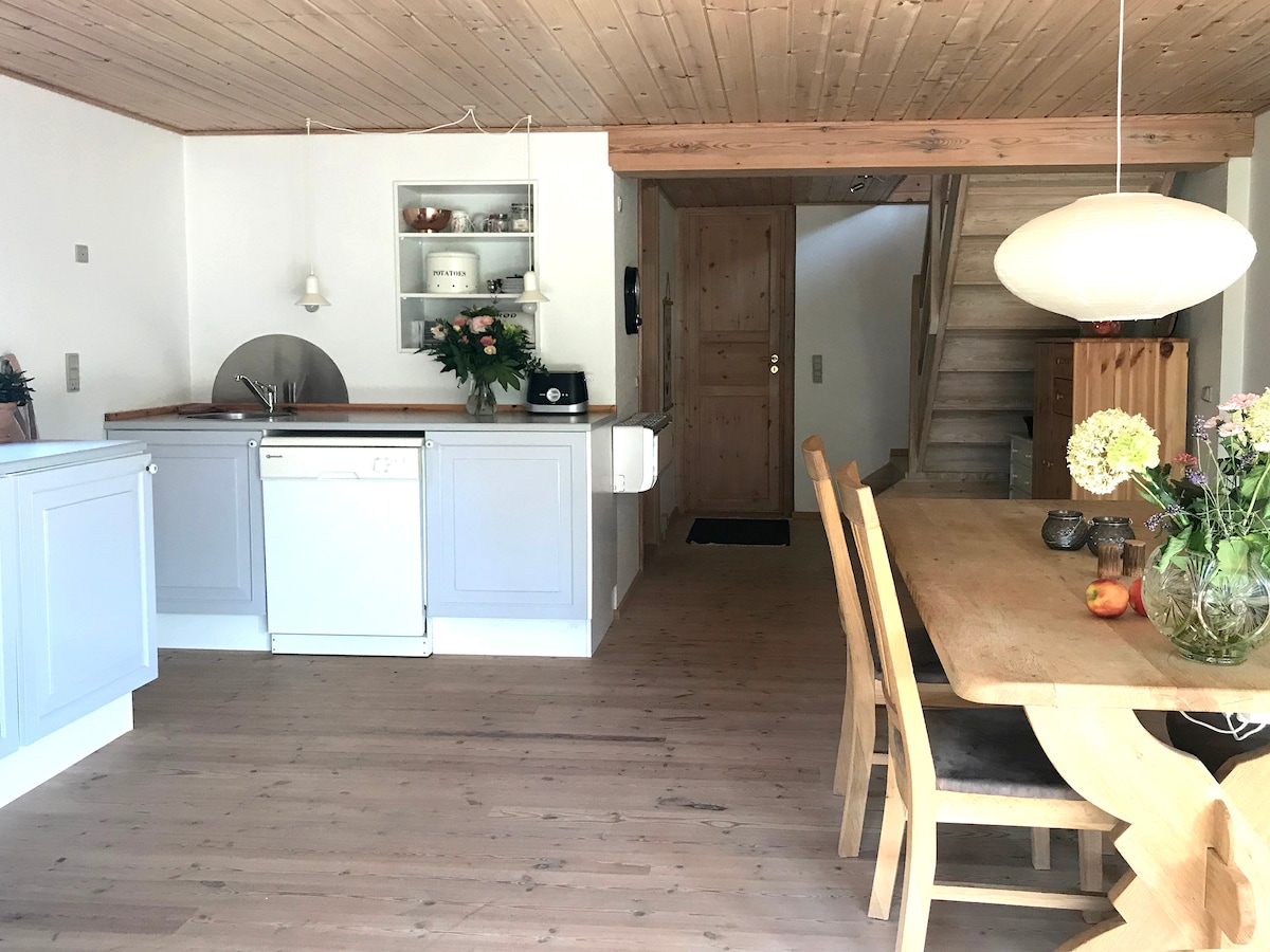 Une charmante propriété de trois étages, magnifiquement située à la périphérie de Skafterup et sur la route de Bisserup, où il y a une plage de sable et un port confortable local. Un appartement de 80 m2 avec salon ouvert et cuisine, poêle à bois et un accès direct au jardin. Concentrez-vous sur le développement durable avec, entre autres, des meubles recyclés. La propriété a été rénovée dans le respect des anciens principes - fenêtres en contreplaqué (1809) peintes à l'huile de lin, travaux de reliure avec chevilles, isolation en laine de papier, toit de chaume, etc. Le tri des déchets et le recyclage sont également importants