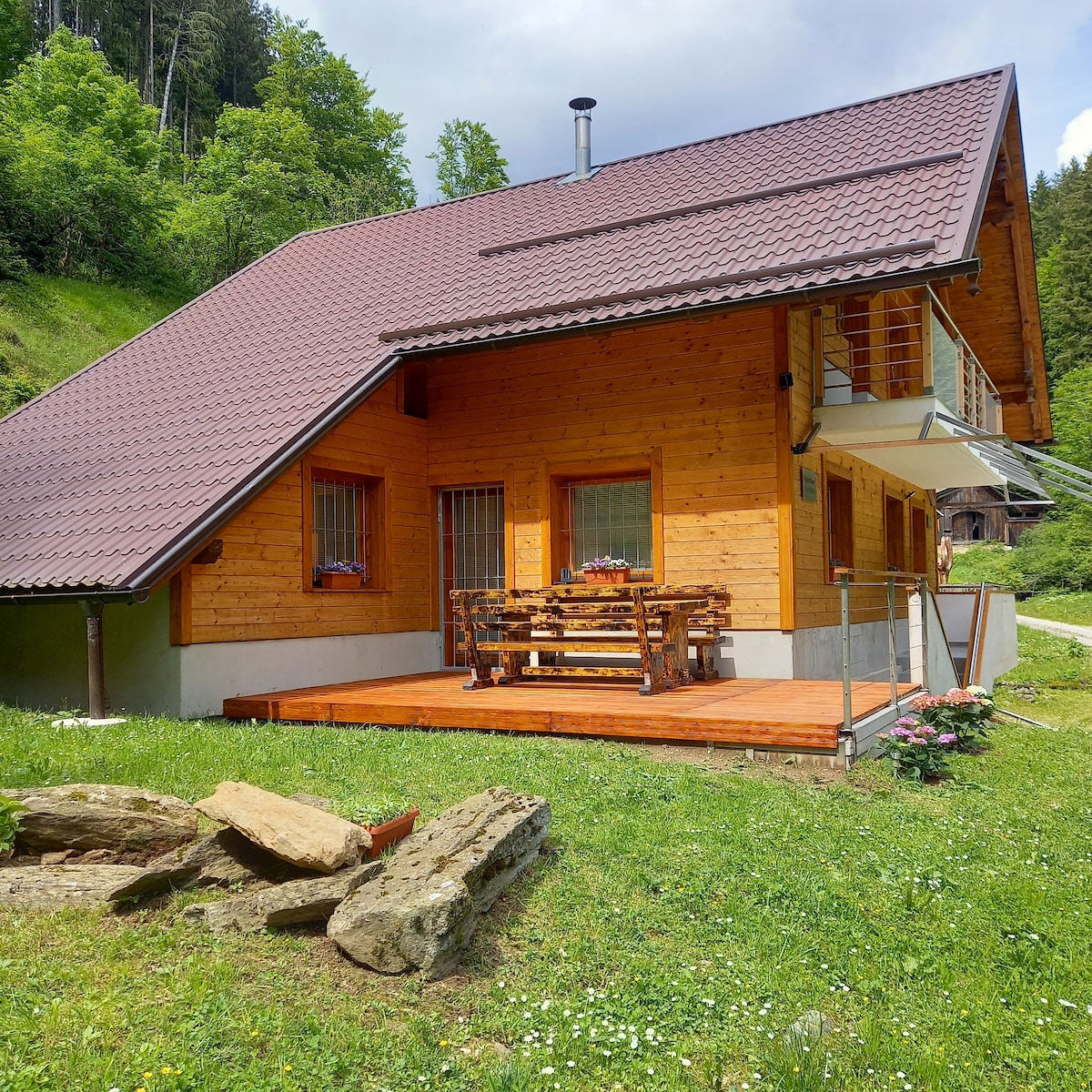 Un charmant chalet familial de deux étages dans un emplacement exceptionnel,( 1000 m de hauteur), offrant une vue imprenable. Cette retraite confortable dispose d'un salon spacieux, d'une chambre principale et d'une salle de bains avec douche au rez-de-chaussée. Le grenier lumineux et spacieux comprend deux chambres interconnectées, une autre salle de bain et un sauna infrarouge pour une détente ultime. Il dispose d'un espace extérieur généreux avec un délicieux lieu de pique-nique, un barbecue et des jardins bien entretenus.