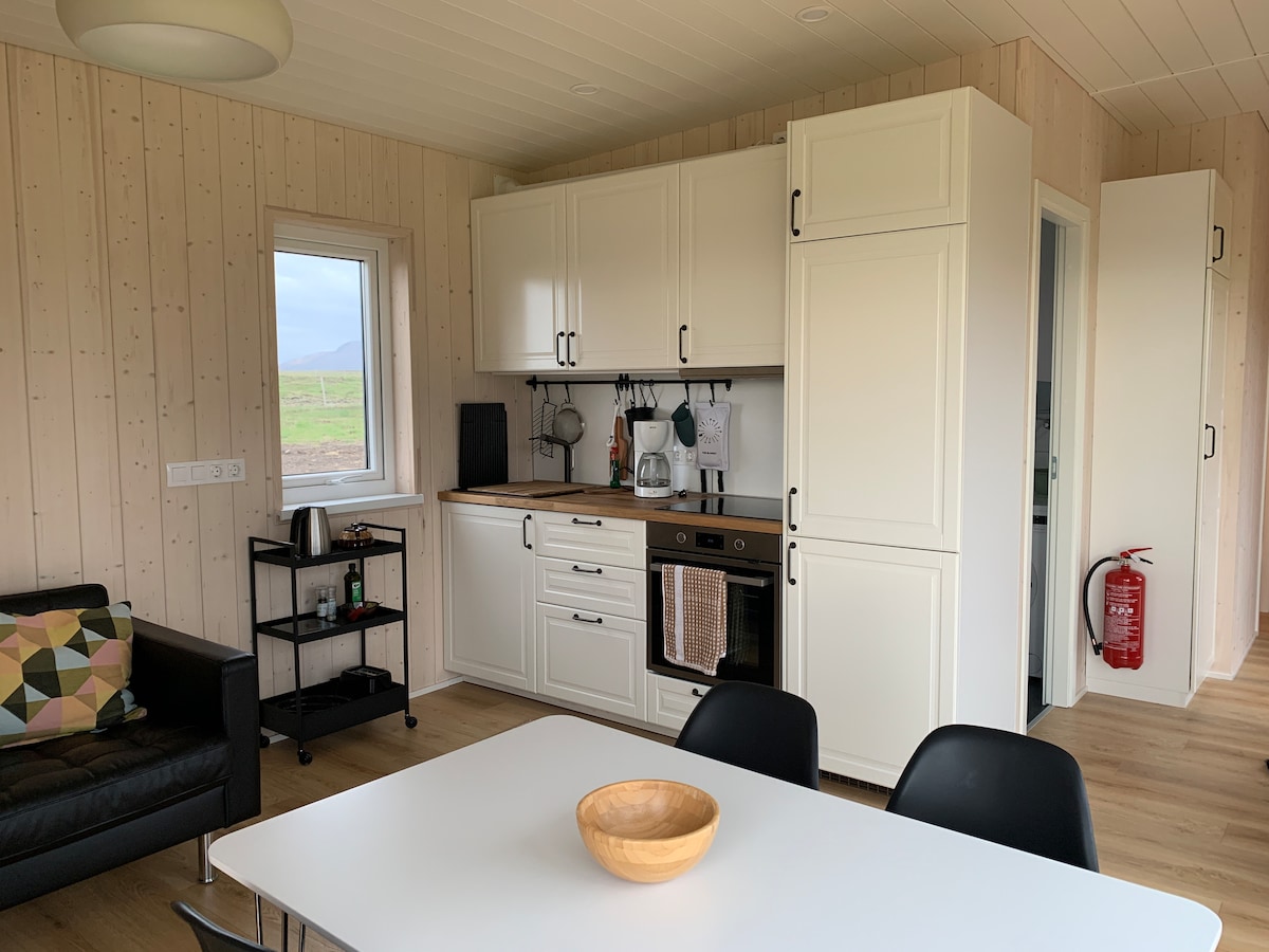 Tout nouveau chalet confortable de 52 m² avec deux chambres, situé dans notre ferme Hraunháls sur la péninsule de Snæfellsnes. Entre Stykkishólmur (20 km) et Grundarfjörður (20 km). Le chalet dispose de toutes les commodités de base, cuisinière avec four, bouilloire, cafetière, grille-pain, réfrigérateur et congélateur, machine à laver, écran plat intelligent et connexion Wi-Fi gratuite. Il y a un joli patio autour du chalet où vous pourrez profiter de la belle nature et de la vue, écouter les oiseaux chanter en été et repérer les aurores boréales en hiver.