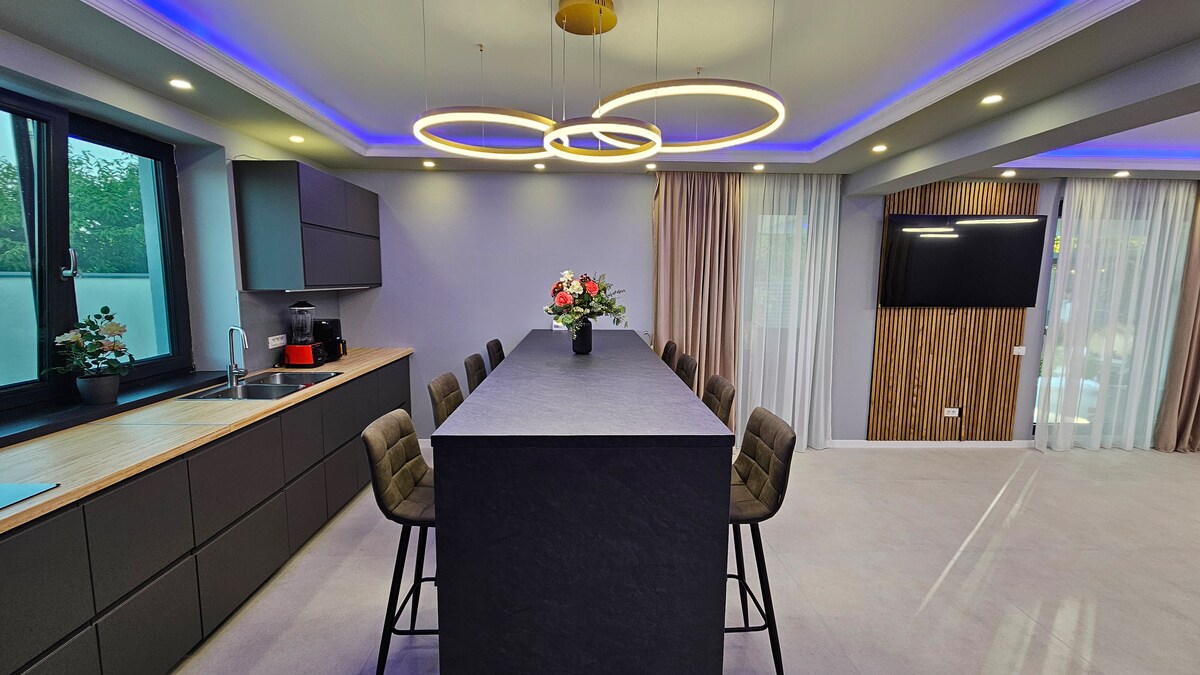 Bienvenue dans notre villa moderne de 7 chambres, un havre de confort et de tranquillité près de la charmante forêt de Snagov. Chaque chambre est équipée de sa propre salle de bain privée, ce qui garantit l'intimité et la commodité de tous vos voyageurs. Le salon ouvert communique parfaitement avec une cuisine moderne. Sortez sur la terrasse, où vous pourrez vous détendre avec un café du matin ou profiter du soleil du soir. Et pour ceux qui aiment faire des grillades, notre espace barbecue est à votre disposition pour savourer des repas en plein air en famille et entre amis.