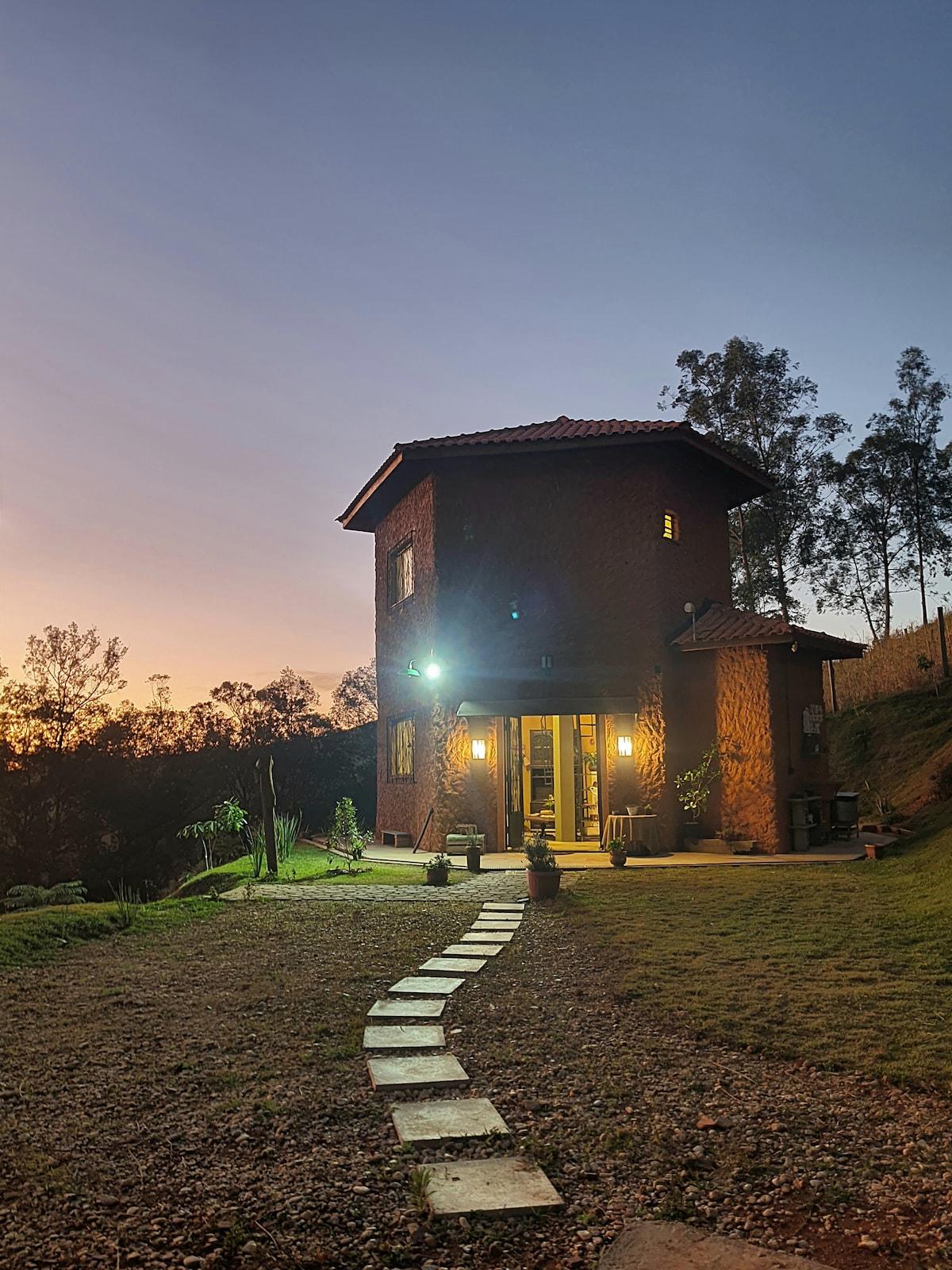 Refúgio romântico em meio à natureza, ideal para casais. Chalé estilo suíço (A-frame) em sítio cercado por cafezais, com rio e cachoeira particulares. Possui banheiras externas com vista para a Serra da Mantiqueira, jacuzzi interna, fogueira, churrasqueira, quadra de beach tênis, cama-balanço, sauna seca com vista e projetor interno com telão de 100”.