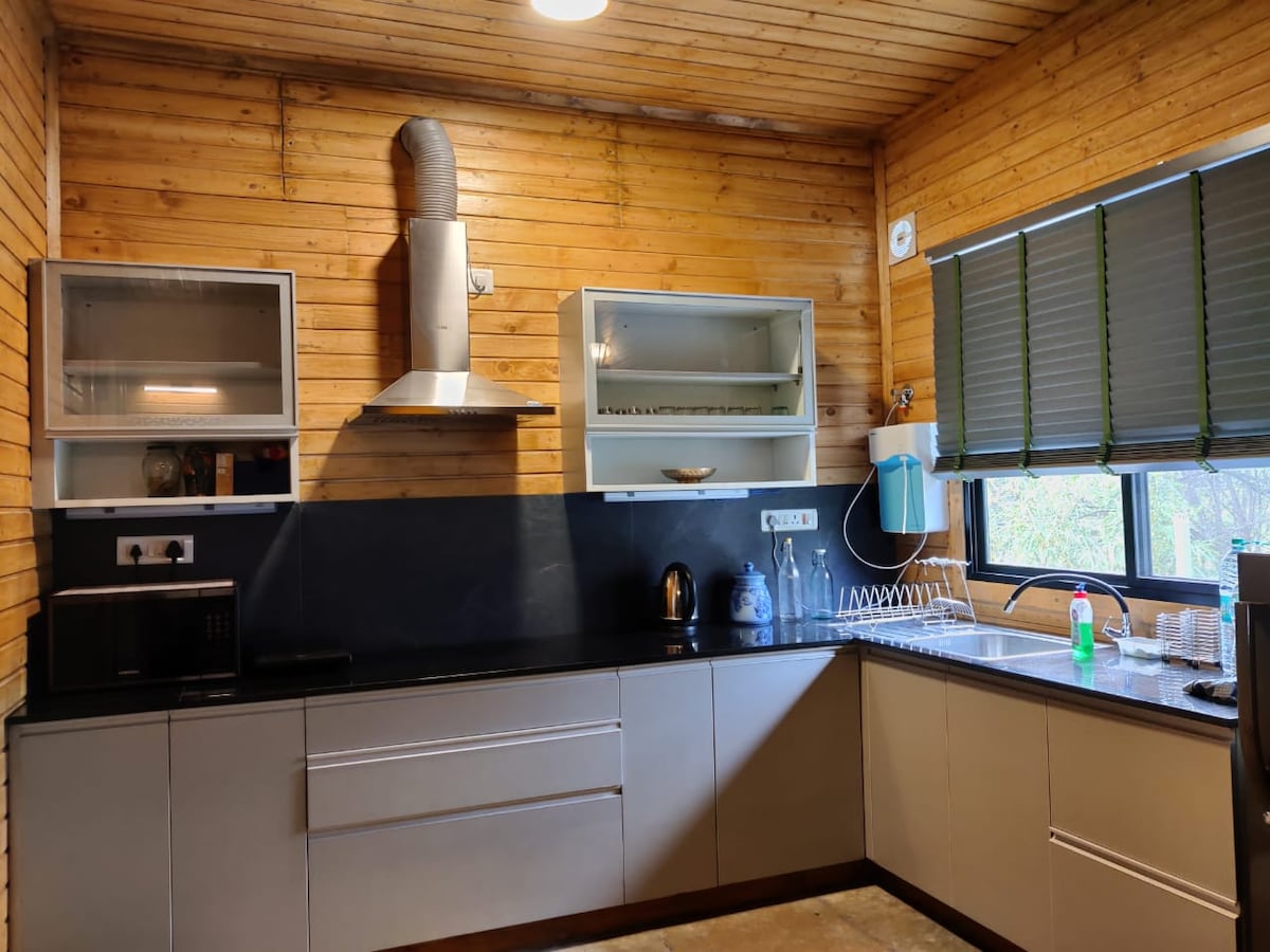 Nous vous invitons à renouer avec la nature et à vous redécouvrir à « The WodeHouse ». Notre spacieux chalet de 2 500 pieds carrés, bois, pierre et carrelage, construit et entretenu selon des principes verts, dispose d'un terrain de 10 000 pieds carrés et d'un jardin avec un brasero et un grand parking. L'espace de vie bien meublé dispose d'une chambre simple, d'un salon et d'une salle à manger ouverts avec kitchenette, de deux salles de bains et d'un vaste balcon à l'étage supérieur. Un canapé-lit cum signifie que c'est parfait pour une famille de quatre personnes ou un petit groupe.