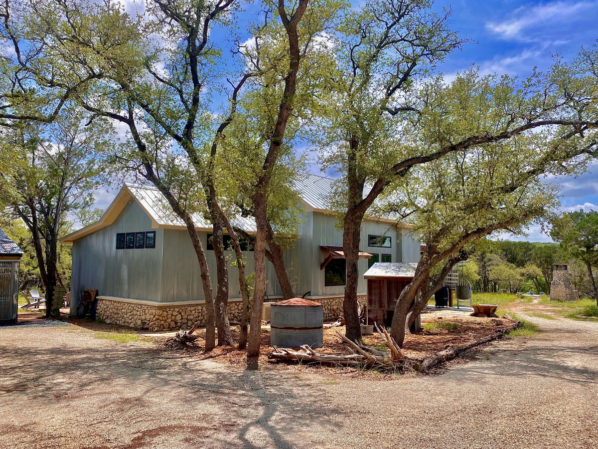 Belle maison « Hill Country Modern » sur cinq acres avec vue sur notre étang saisonnier et la vallée. Notre maison intègre l'utilisation de l'espace de vie extérieur comme aucune autre. Le patio et le couloir font partie intégrante de l'espace utilisable. Un côté de Sunrise House dispose d'un grand salon avec une cheminée et d'immenses fenêtres. La maison dispose d'appareils et de finitions haut de gamme, d'un mélange de meubles et de décorations neufs et organisés, et de belles œuvres d'art personnalisées.