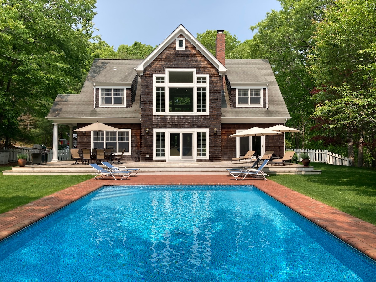 RÉSERVATION INSTANTANÉE/les dates sont à jour. Maison privée et immaculée de 3 chambres / 2 salles de bain au cœur d'East Hampton, située sur 1,3 acre. La maison dispose d'une cuisine de chef, d'une piscine fermée creusée dans le sol, et d'une intimité et d'une détente totales. Proche du village d'East Hampton (5 min) et des plages d'East Hampton, d'Amangansett et de Bay (7 min), de Montauk (20 min) et de Sag Harbor (15 min). Les enfants adorent l'immense aire de jeux ! Toute la propriété est clôturée pour assurer la sécurité des enfants ! Piscine chauffée ouverte : du Jour du Souvenir au 30 septembre.