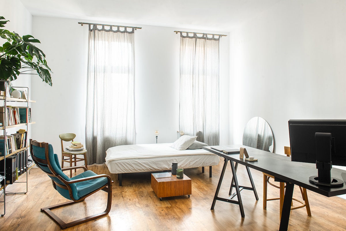 Un espace post-industriel extrêmement atmosphérique situé au rez-de-chaussée du bâtiment, qui abritait autrefois une imprimerie. Au même niveau, il y a un studio photo, une salle de répétition et un atelier de peinture. Les clients ont à leur disposition deux chambres, une grande cuisine, des toilettes avec douche, une terrasse privée. Pendant les saisons chaudes, vous pourrez vous détendre dans les hamacs sur la terrasse. Attention ! Nous attachons une grande importance à la propreté et à l'hygiène. Toutes les chambres sont TRAITÉES À L'OZONE avant l'arrivée et après le départ des clients.