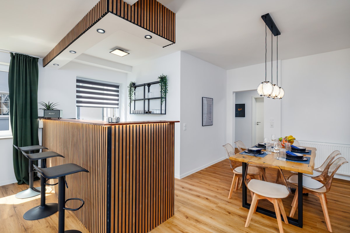 Le nombre minimum d'invités est de 2. Détendez-vous dans notre appartement calme de 65 m² avec chauffage au sol et entrée privée. Les moyens de transport tels que le bus, le train, le train de banlieue sont accessibles à pied. A disposition : Chambre avec un lit double 1,80m/2m. Possibilité de couchage pour 5 personnes supplémentaires. Un grand salon avec une Smart TV et un bureau. Cuisine équipée avec réfrigérateur, micro-ondes, machine à café, bouilloire et cuisinière. quartier résidentiel calme