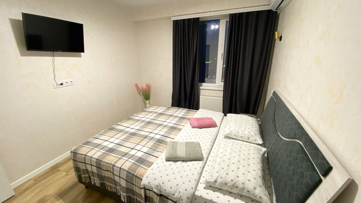 Un studio confortable avec une récente rénovation dans une nouvelle maison dans un quartier résidentiel de Chisinau. Design moderne et tous les appareils et meubles. Lit transformateur (grand lit king size) ou peut être séparé en deux lits séparés). La maison est un nouveau bâtiment avec ascenseur. Quartier calme. Transports en commun (arrêt à la maison). Divers commerces, restaurants, pharmacie, banque. Le centre de Chisinau se trouve à 20 minutes. Le transfert depuis l'aéroport est possible.