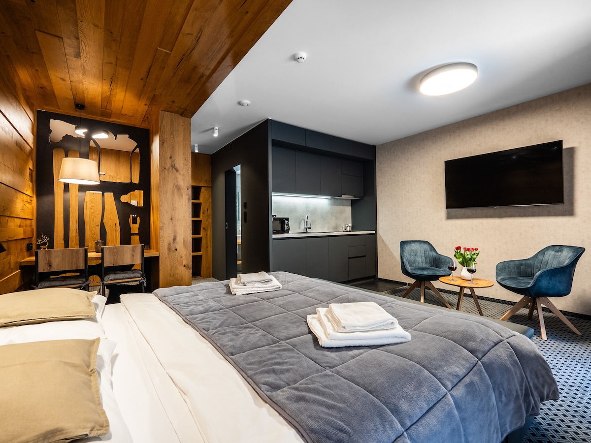 Cet appartement spacieux et aéré répondra à tous vos désirs d’hébergement moderne avec son propre espace bien-être pour 4 personnes maximum. Appartement avec lit double king size (180x200) et canapé-lit dans le salon pour 2 personnes, coin cuisine et terrasse avec bain à remous. Vous pouvez profiter de la vue panoramique sur les montagnes environnantes directement depuis le jacuzzi. Que demander de plus ? Mettez vos pieds sur la table et détendez-vous dans cet hébergement calme et élégant. Le bâtiment comprend également un sauna finlandais.
