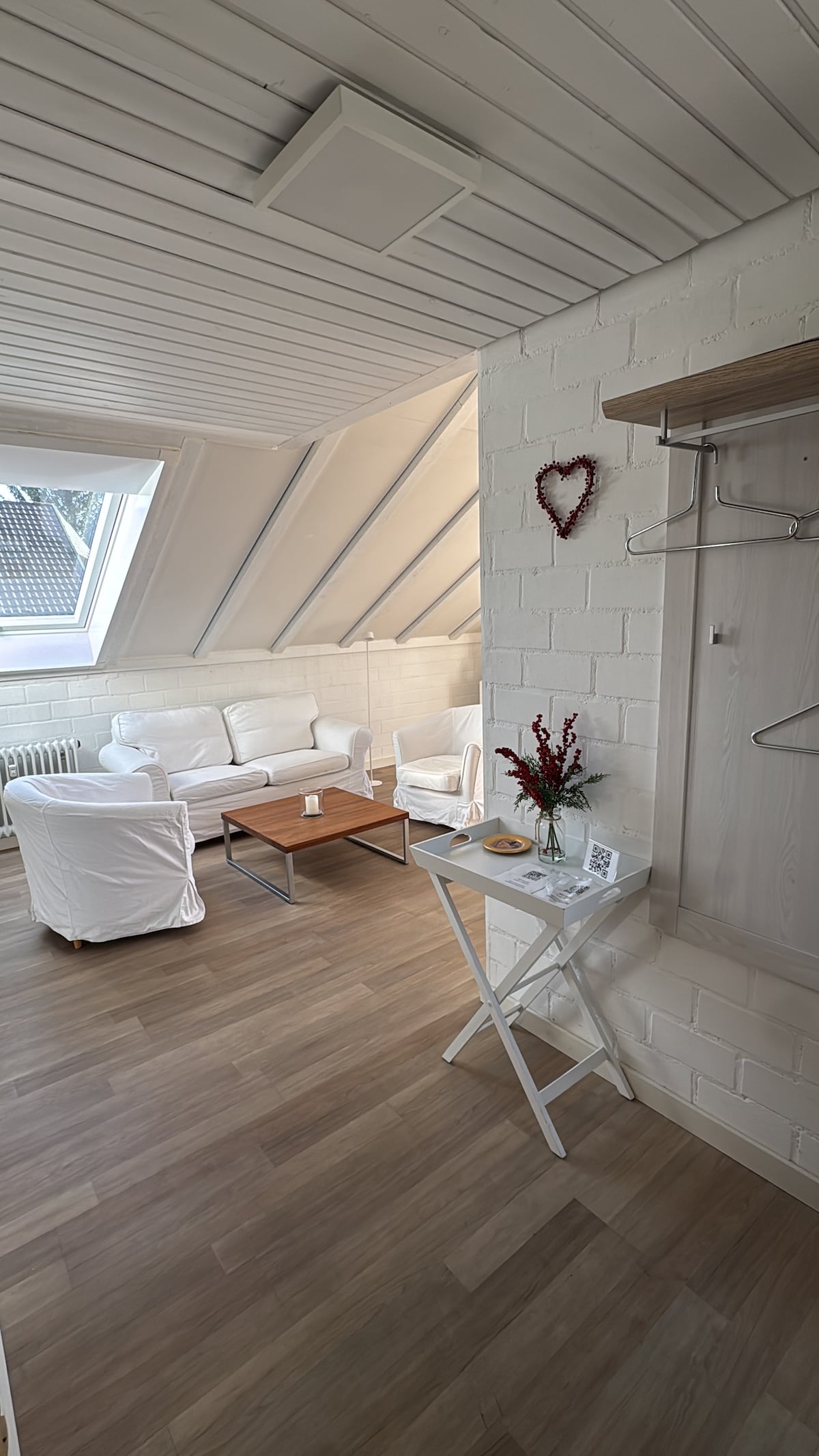 Notre appartement mansardé joliment décoré - veuillez noter qu'il y a quelques escaliers à monter - a tout ce dont vous avez besoin pour un séjour plus court ou plus long et est utilisé par vous seul. Calme au bout d'une rue résidentielle, proche du centre + S-Bahn. Le loft marque des points avec un balcon couvert orienté sud-ouest, la climatisation, une connexion Wi-Fi gratuite, un placard accessible, un lave-linge séchant, un espace sauna qui peut être utilisé sur demande, une possibilité de recharge pour voiture électrique. Si nécessaire, une autre chambre double à côté.