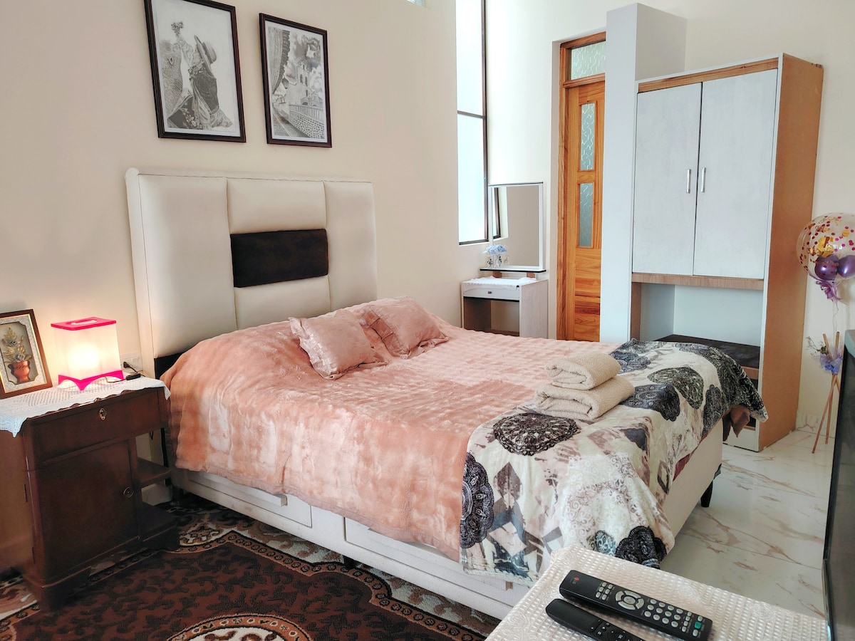 Estudio completo para 2. Disfruta de la comodidad: cama matrimonial, baño privado, TV y una cocineta equipada para que prepares tus comidas. 🌿 Extra: Acceso a patio compartido y una azotea con vistas panorámicas. Ubicación Estratégica: Zona residencial tranquila. A 5 min. en auto del Centro y Terminal. Micros al centro a 1 cuadra.(15-20 min. caminando a la plaza principal). Plazuela y mercados a 1.5 cuadras. 🔷 Acceso por gradas (segundo bloque). La tranquilidad vale la pena. ¡Bienvenidos!
