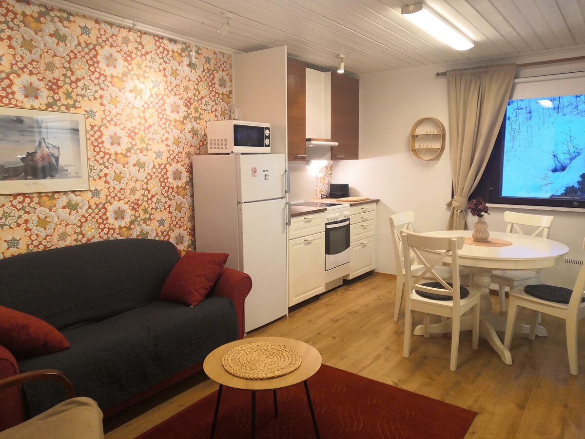 L'appartement indépendant de notre maison individuelle bien entretenue est situé à proximité du centre de Kangasala (0,5 km). Notre appartement dispose de deux pièces, à savoir une chambre et un salon, ainsi que d'une kitchenette et d'une salle de bain. Notre appartement dispose de vaisselle, d'une cafetière et d'une bouilloire, d'une cuisinière à induction, d'un four, d'un micro-ondes, d'un lit double et d'un canapé-lit. Des matelas supplémentaires sont disponibles si nécessaire. Les invités ont un parking dans la cour. Près du lac Ukki et de superbes terrains de jogging à Kirkkoharju. Bonnes liaisons de transport vers Tampere, en bus env. 30 min, arrêt à 150 m.