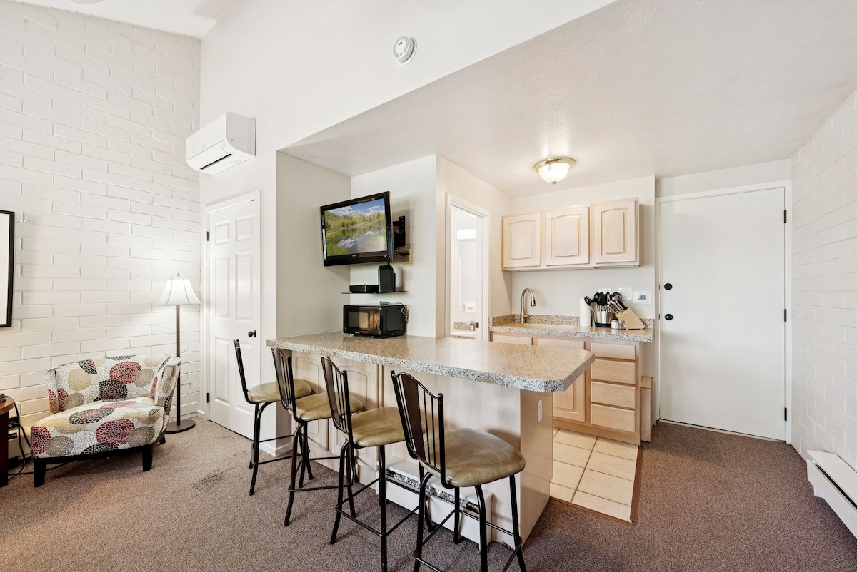 EMPLACEMENT !! Petit studio au Town Lift au cœur de Main Street. Cet appartement offre le summum de la fonctionnalité et du style : un salon avec un canapé qui se transforme en un lit Queen Size confortable, une kitchenette avec réfrigérateur, micro-ondes et Keurig et un comptoir de restauration qui se transforme en lits superposés pour les enfants ou les amis supplémentaires. Profitez de l'espace détente partagé sur le toit avec jacuzzi, foyer et barbecue. *Stationnement gratuit. *WiFi haut débit. * Restaurants, bars, randonnée et magasins à quelques pas.