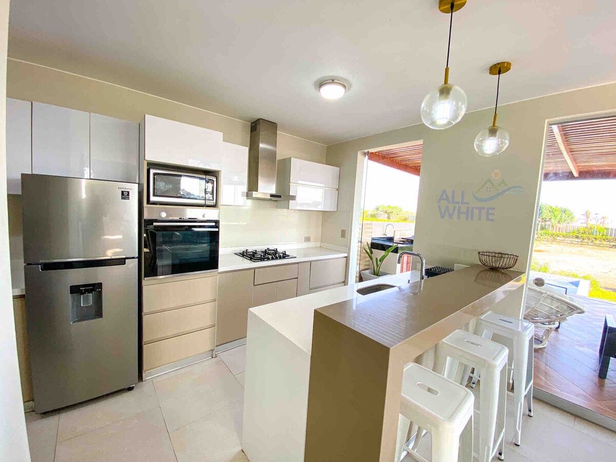 Bonita casa de playa en primera línea. Vista hermosa a toda la inmensidad del mar, desde la terraza, desde la cama y balcón principal, desde la cocina, desde la sala principal y sala de estar, desde la puerta cerca al bar. Relájate en un lugar tranquilo con brisa marina, cielo azul y sonido de las olas. Descansa en la hamaca, en las tumbonas Refréscate en la piscina! Internet Satelital Starlink, ideal para trabajo remoto, realiza videollamadas en HD (Zoom, Teams, Meet), toda la familia conectada
