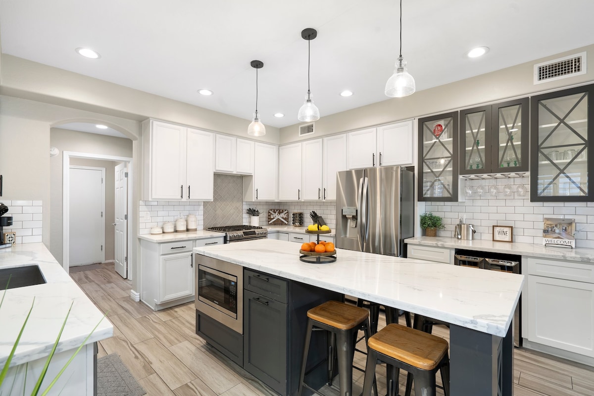 Venez vous détendre au Rancho Redondo ! 4 chambres, 3 salles de bain, rénové. Profitez de l'ambiance moderne du milieu du siècle dans cette maison de ranch en briques d'adobe des années 1960. L'espace privé comprend une cour arrière spacieuse, une piscine chauffée chic et un jacuzzi, un foyer à gaz et un espace barbecue. Le stade des Cardinals (State Farm Stadium) se trouve à environ 8 miles, avec les sites d'entraînement de printemps de West Valley, les magasins et les divertissements à proximité. Dînez au Wigwam Resort, qui est à seulement un pâté de maisons. Ce sont tous les équipements dont vous avez besoin pour faire une super escapade !