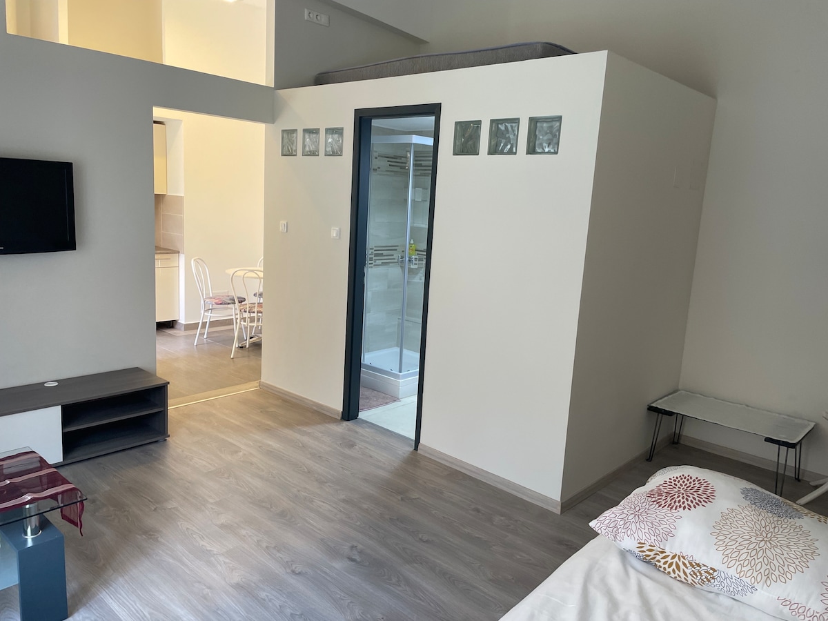 Bienvenue dans notre appartement au cœur d'Esztergom ! Il est situé à distance de marche de toutes les attractions, sites touristiques et commodités. Notre studio moderne et récemment rénové offre une vue imprenable sur le fleuve. L'appartement dispose d'une cuisine bien équipée, de la climatisation, d'une connexion Internet gratuite, d'une télévision et d'un parking gratuit fermé. Convient aux voyageurs d'affaires, aux couples ou aux familles jusqu'à trois personnes. Espace de travail dédié. Réservez dès maintenant et créez des souvenirs inoubliables dans l'une des plus anciennes villes de Hongrie !