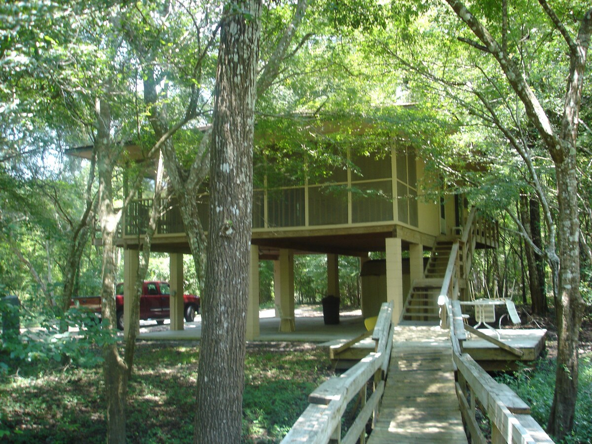 Venez cuisiner, vous détendre, pêcher et faire du kayak (inclus) le long de la rivière Withlacoochee. Cette maison sur pilotis fraîchement rénovée est située à seulement 15 minutes en amont du parc d'État de Suwannee et de ses sources cachées. La terrasse arrière surélevée se trouve à 10 pieds de la berge. La propriété de 4 acres possède de nombreux chênes et pins matures avec un ancien pilier de pont de chemin de fer pour des photos incroyables. Propriété fréquemment visitée par des cerfs, des hiboux et des dindes. Allée privée offrant beaucoup d'intimité et à seulement 25 min du quartier commerçant de Live Oak.