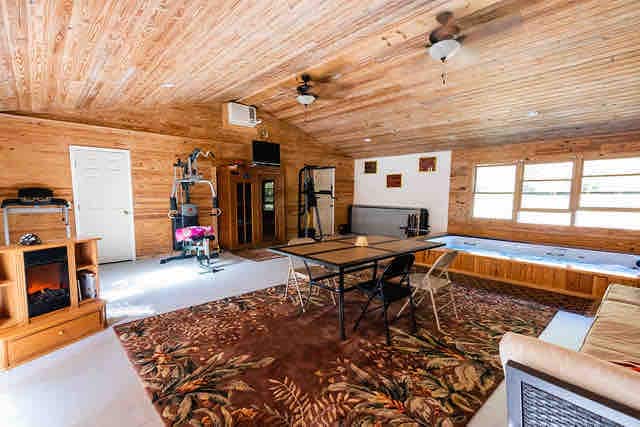 La cabane en rondins d'Ichetucknee Springs est l'Airbnb le plus proche de la source mondialement connue d'Ichetucknee Springs/River. Cette belle cabane en rondins authentique entièrement personnalisée, 3 chambres, 2 salles de bain. (Tucknee Inn) a de belles sculptures d'animaux en bois et des tables de rivière dans toute la maison. À l'extérieur, détendez-vous dans le jacuzzi ou racontez des histoires de feu de camp dans notre espace de feu de camp sur mesure. La cabane dispose également d'une immense douche en pierre personnalisée, d'un grand loft qui sert de deuxième salon et de chambres spacieuses.