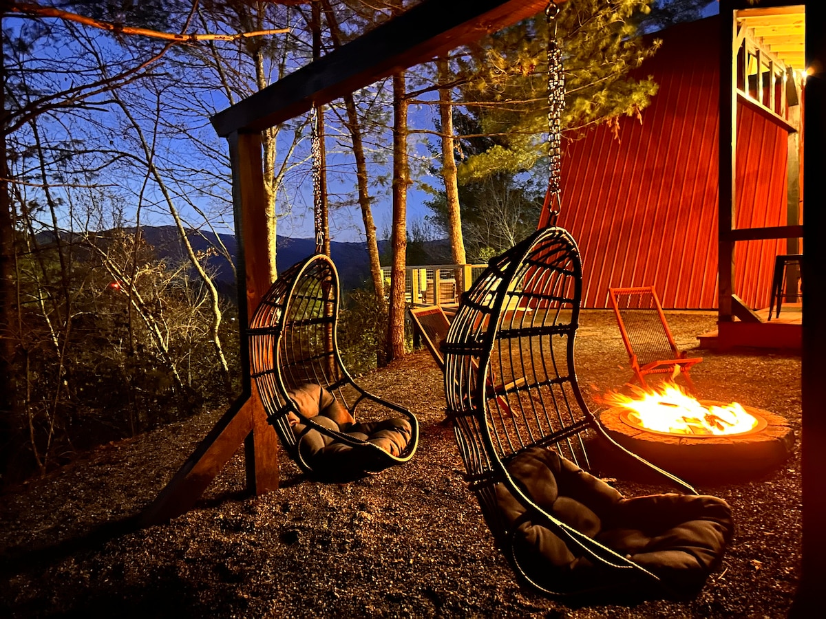 Le Red Shed A-Frame avec une vue imprenable sur les Smoky Mountains a été rénové en une oasis privée magnifique et unique ! À moins de 10 minutes de la ville ! Le havre extérieur privé et isolé comprend un jacuzzi avec gazebo, un bar, une douche extérieure. Foyer, chaises œufs, barbecue, grande terrasse, spirobole. Vous ne voudrez plus jamais partir ! À l'intérieur, un bel espace design Parklin Interiors, une toute nouvelle cuisine, un bar à café, et bien plus encore ! Grand loft avec lit King Size avec vue, et en bas une deuxième chambre Queen Size confortable.