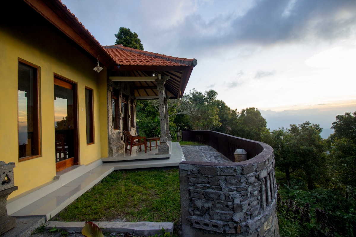 Séjournez dans l'un de nos deux bungalows exclusifs au sommet d'une vallée luxuriante et merveilleusement isolée au bord de la mer. Profitez de votre petit-déjeuner complet gratuit avec une vue à couper le souffle chaque matin. Dormez profondément dans un bungalow naturellement frais avec une luxueuse salle de bain en plein air et un porche avec vue sur la nature. Profitez du temps parfait de Bali pendant que vous dînez (ou cuisinez) dans un espace rustique ouvert avec un salon aéré à l'étage, donnant sur la magnifique piscine. Émerveillez-vous devant des vues imprenables de la vallée au volcan en passant par l'océan.