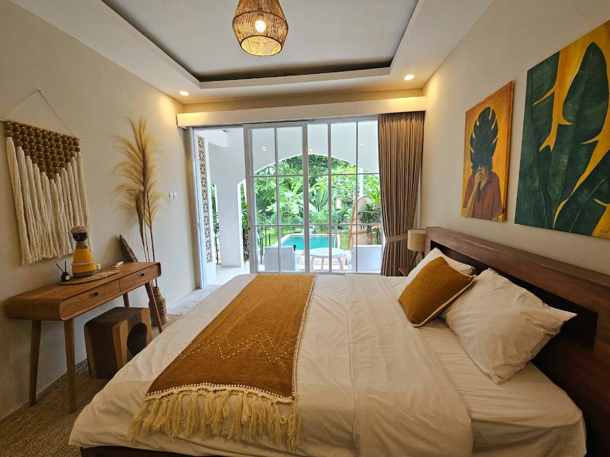 Chambre double privée confortable de style bohème avec salle de bain privative, eau chaude, climatisation et ventilateur dans un quartier très calme à 10 minutes de Seseh et Canggu. La chambre est toute neuve. Votre séjour comprend également : accès à la piscine, fruits frais tous les jours, café, thé et eau à volonté, Wi-Fi haut débit, nettoyage quotidien de la chambre, terrasse de yoga, sécurité 24h/24 et 7j/7. Disponible en option : séances de surf, cours de yoga, prise en charge à l'aéroport. Les détails de ce logement dernier cri ne cesseront de vous étonner.